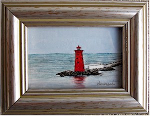 Series of Irish Lighthouse original minuatures by Pervaneh Matthews. This painting features Poolbeg...